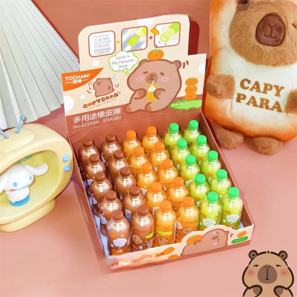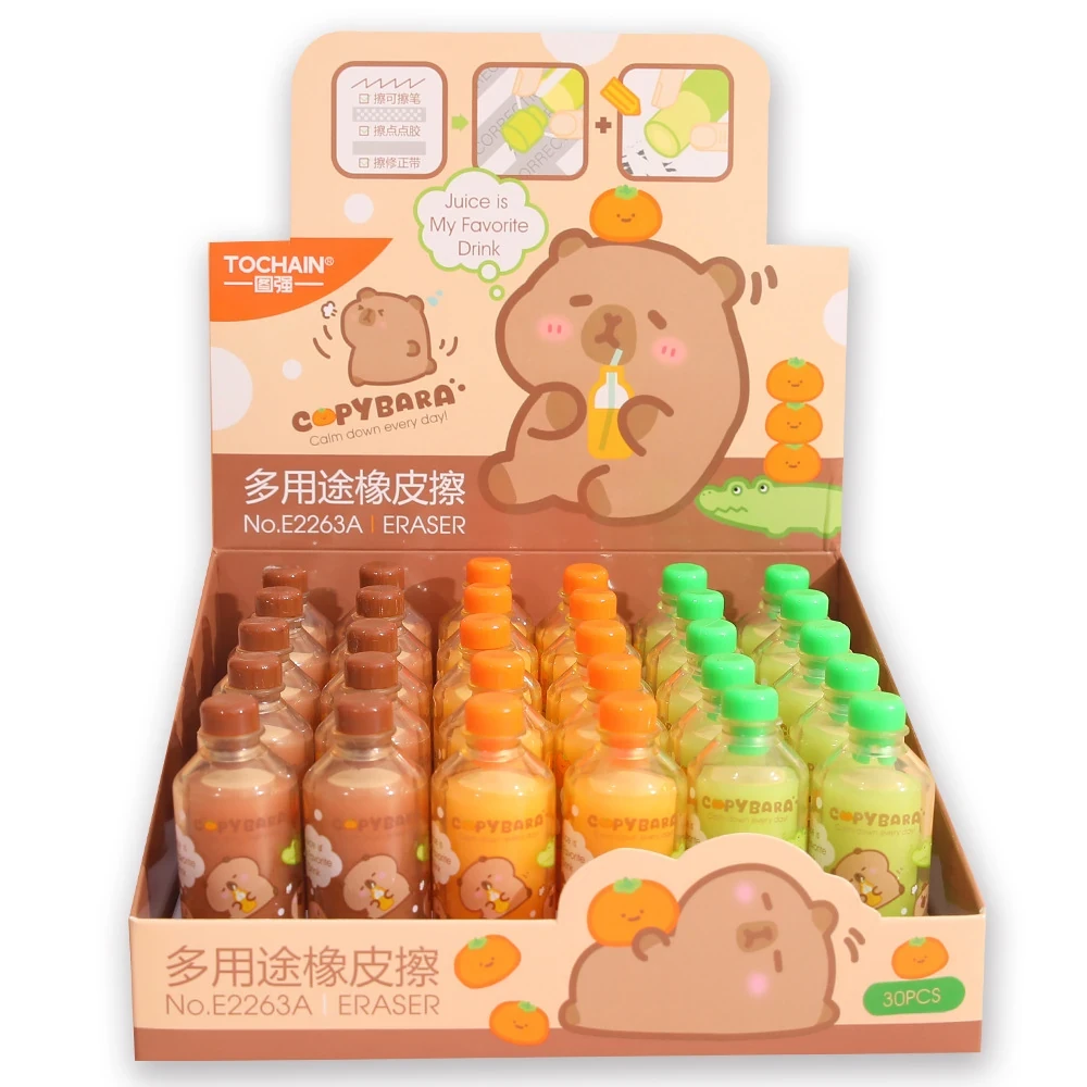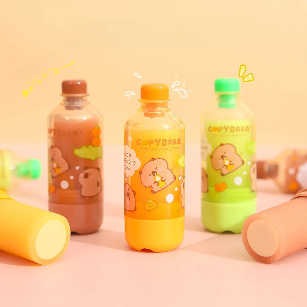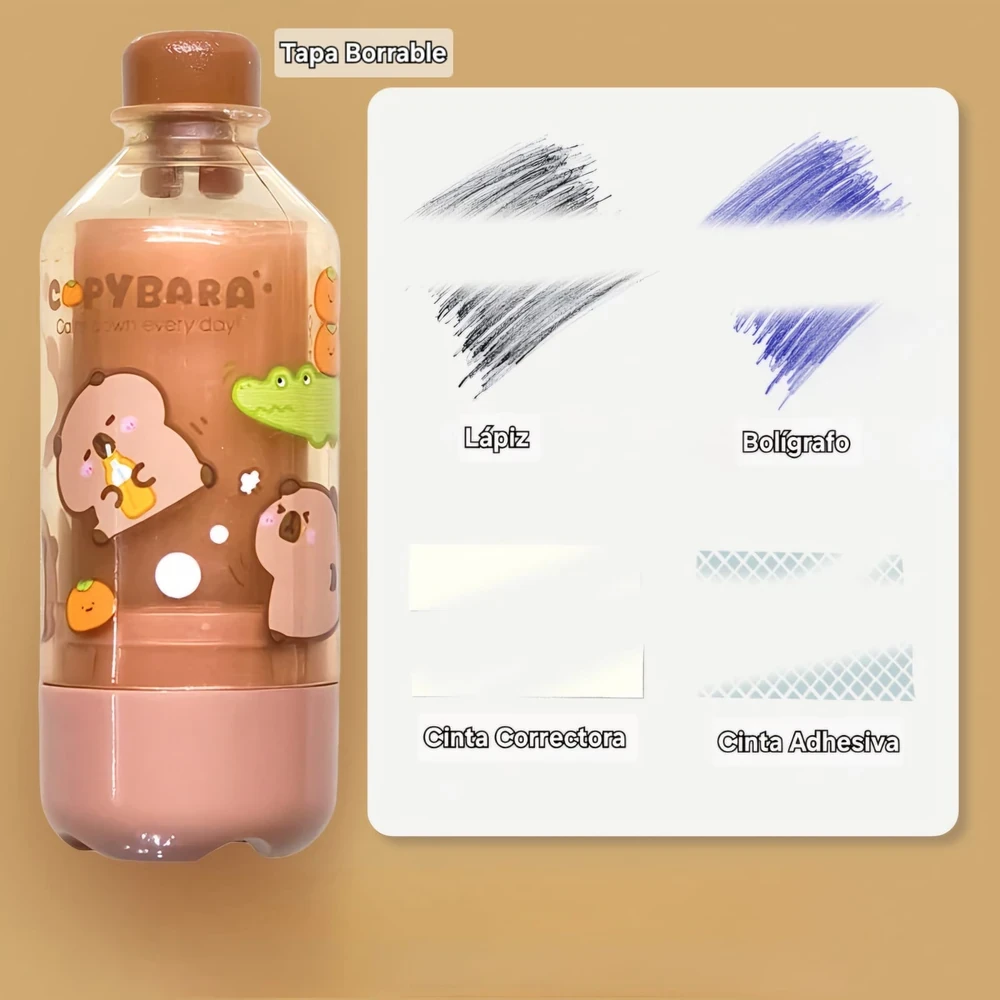 Esta goma con forma de botellita tiene un adorable diseño de capybara que la hace única y súper divertida ✨