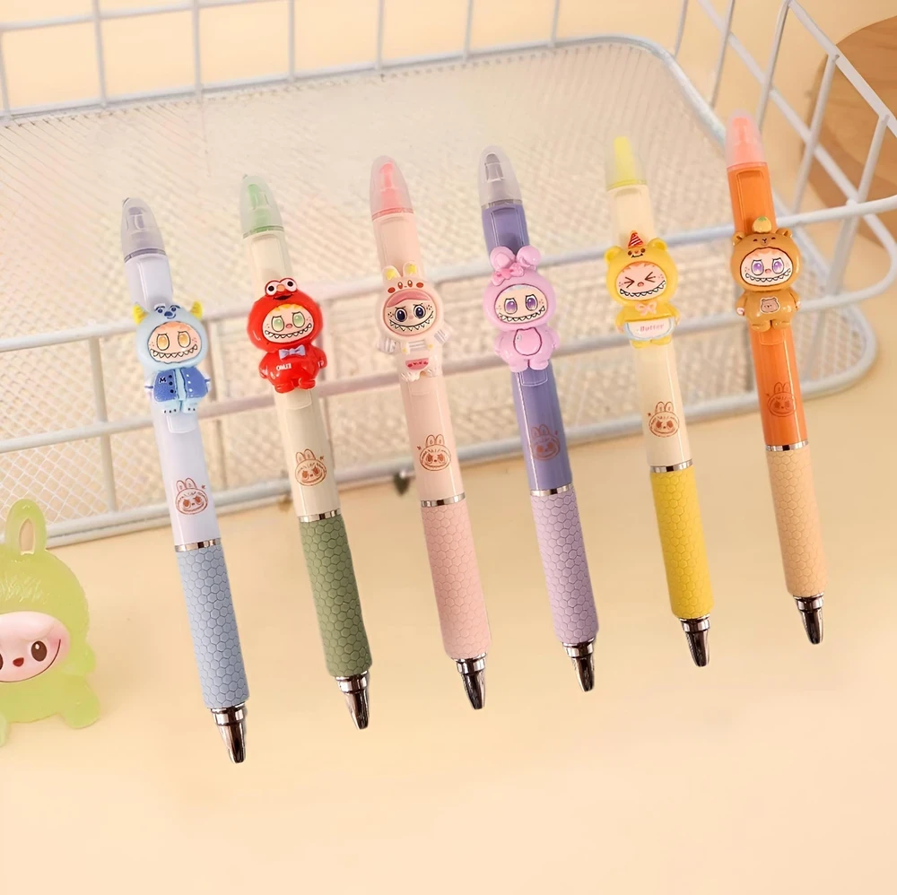 Cada lapicera trae resaltador integrado 🖍️ con un tierno diseño de "Labubu" 🐰 que enamora a primera vista.